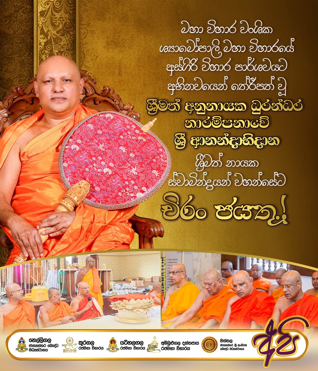 රාජපූජිත අස්ගිරි මහාවිහාරයේ සම්ප්රසාදන ශ්රීමත් මහානායක ස්වාමීන්ද්රවර ප්රමුඛ “රාජූපස්ථානීය පරමධම්ම සභා” නම් වූ සානුනායක විංශද්වර්ගික ගරුතර කාරක මහා සංඝ සභාව වෙතින්, අස්ගිරි මහාවිහාර පාර්ශ්වයේ අභිනව ශ්රීමත් අනුනායක පදවියෙන් පිදුම් ලැබූ, ඓතිහාසික මැදගොඩ ගල්ගාන රජමහ විහාරය, කරලියැද්ද ජම්බරුක්ඛාරාම පුරාණ විහාරය, උඩිස්පත්තුව පුරාණ විහාරය ඇතුළු විහාර ගණයේ අධිපති, විශ්රාම ලත් මහාවිහාර මහ පිරුවෙන්පති, ශාස්ත්රපති, ගෞරවාර්හ නාරම්පනාවේ ශ්රී සුමනතිස්ස ආනන්දාභිධාන නායක මාහිමිපාණන් වහන්සේට, සෙංකඩගල කිරිමුහුද මතුයෙන් ධවල පැහැයෙන් බබළන සිරි දළදා වාසල තුළ සිංහාසනාරූඪ ව විරාජමාන ව වැජඹෙන පරමාතිපූජනීය වම් දළදා රජ්ජුරුවන් වහන්සේගේ අනන්තාශීර්වාදයෙන් නිදුක් නිරෝගී චිරජීවන සම්පත්තිය මැද විංශත් ශතවර්ශාධික කාලයක් සුව සේ උතුම් රටදැය සසුන් හොබවන්නට පාදාභිවන්දනයෙන් යුක්ත ව ශුභාශිංසනය කර සිටුම්හ෴
